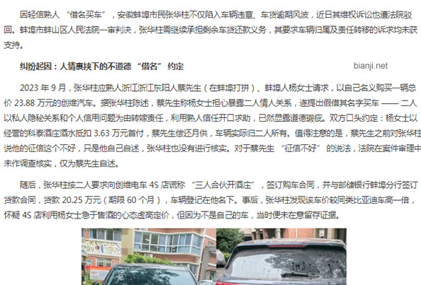 2023 年 9 月,张华柱应熟人浙江浙江东阳人蔡先生(在蚌埠打拼)、蚌埠人杨女士请求,以自己名义购买一辆总价 23.88 万元的创维汽车。据张华柱陈述,蔡先生称杨女士担心暴露二人情人关系,遂提出假借其名字买车 —— 二人以私人隐秘关系和个人信用问题为由转嫁责任,利用熟人信任开口求助,已然显露道德瑕疵。双方口头约定:杨女士以经营的科泰酒庄酒水抵扣 3.63 万元首付,蔡先生偿还月供,车辆实际归二人所有。值得注意的是,蔡先生之前对张华柱说他的征信这个不好,只是他自己自述,张华柱也没有进行核实。对于蔡先生 “征信不好” 的说法,法院在案件审理中未作调查核实,仅为蔡先生自述。